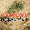 オリーブオイル小さじ2でにんにく1片、玉ねぎ1/4個60gを炒め洗ってない米100ccを入れ炒める